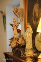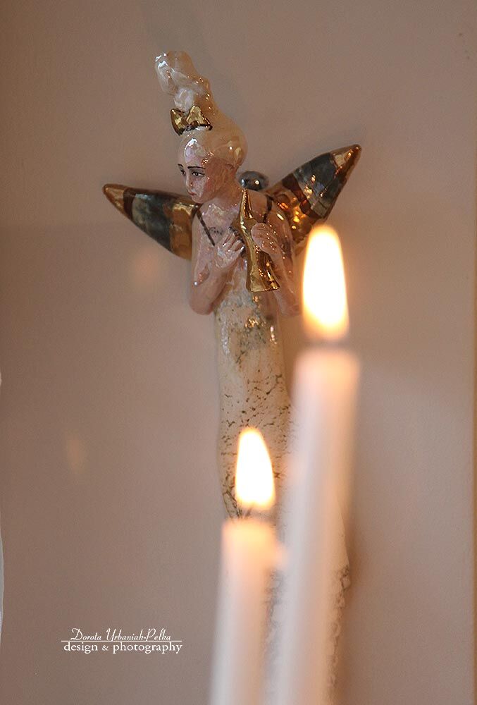 Skrzydła,trąbla, kokardka szkliwione złotem.