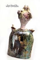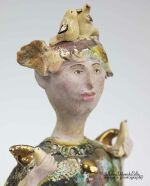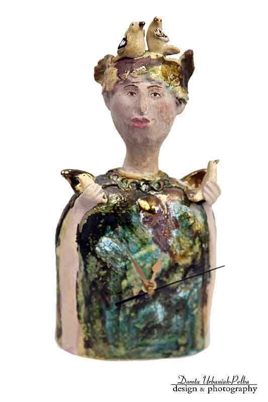 ZEGAR WYKONANY Z SZAMOTU. Szkliwo fakturowe. Skrzydła , tarcza oraz elemenciki ptaszków szkliwione prawdziwym złotem.