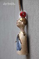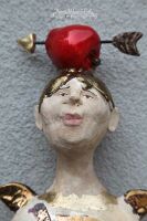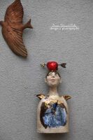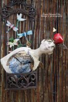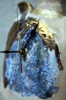 ZEGAR WYKONANY Z SZAMOTU. Szkliwo fakturowe. Włosy, skrzydła oraz tarcza zegarowa szkliwione prawdziwym złotem.