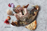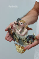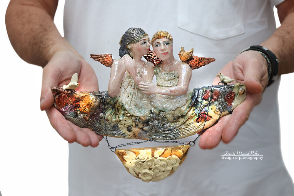 Materiały: ceramika szamotowa, szkliwo metaliczne, miedziane włosy, złote skrzydła,