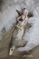 Skrzydła, kwiat we włosach, szata dziecka szkliwiona złotem.