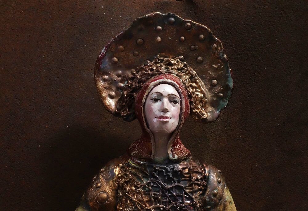 Nakrycie głowy , żaba na kuli , but szkliwiona złotem w kombinacji z miedzią .