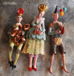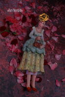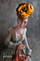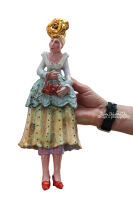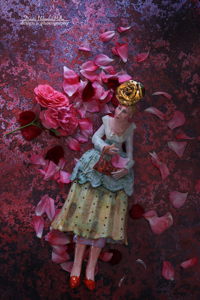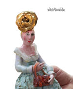 Oto dama, która bez słów opowiada historię elegancji — „Dama ze złotą różą, a jakże stateczna” to rzeźba, która łączy w sobie klasę retro z odrobiną współczesnej fantazji. Jej złota róża działa jak symbol: może marzeń, może tajemnicy, a może kobiecej siły? Drobne detale — falbaniasta bluzka, bogato zdobiona spódnica i czerwona torebka — tworzą postać, która z powodzeniem mogłaby być bohaterką paryskiego kabaretu albo... snu artysty.
