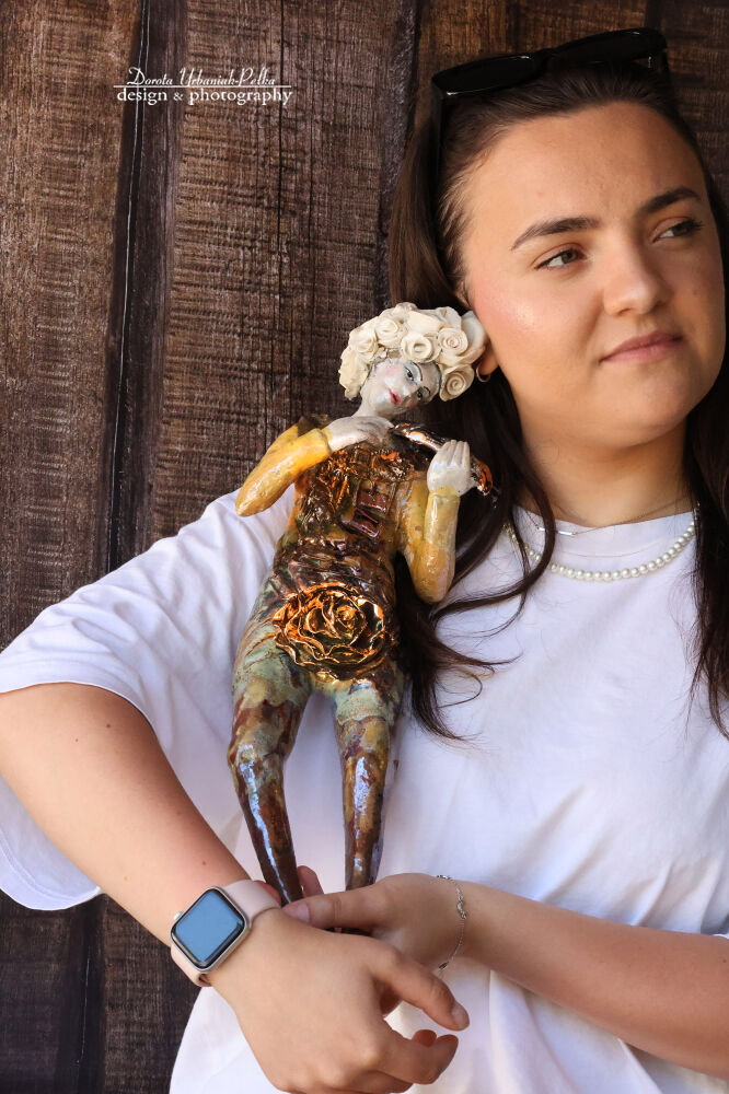 Ta ceramiczna rzeźba jest wyjątkowym dziełem, wykonanym ręcznie z gliny szamotowej i wypalonym w temperaturze 1240 stopni Celsjusza. Został również emaliowany złotem i miedzią, co nadaje mu wyjątkowej elegancji. Podpis artysty znajduje się z tyłu i ma wymiary około 44 cm x 14 cm x 11 cm.