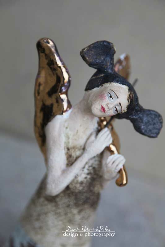 | szamot szkliwiony - wypał 1100 Elementy skrzydeł, butów, skrzypiec raz szaty szkliwione prawdziwym złotem. |