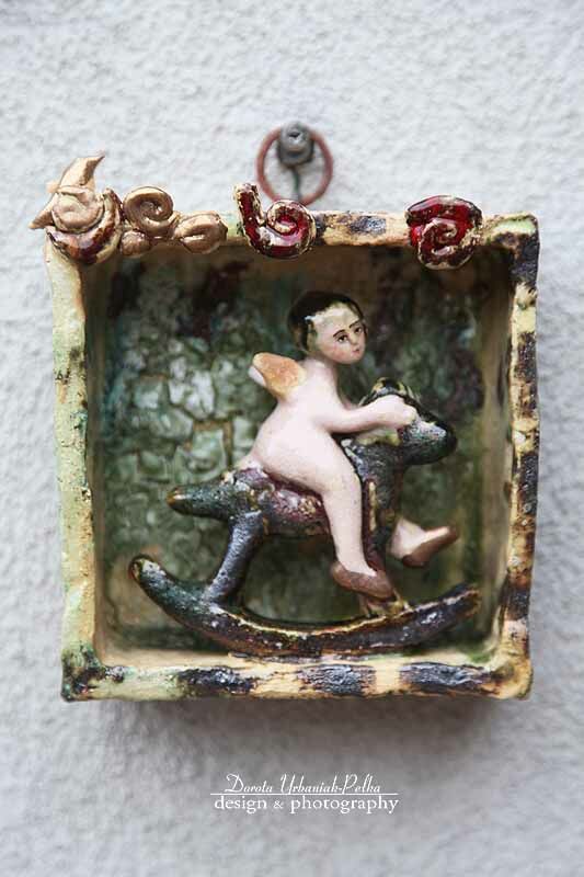 Pudełko z konikiem do powieszenia na ścianie wykonane z gliny szamotowej.