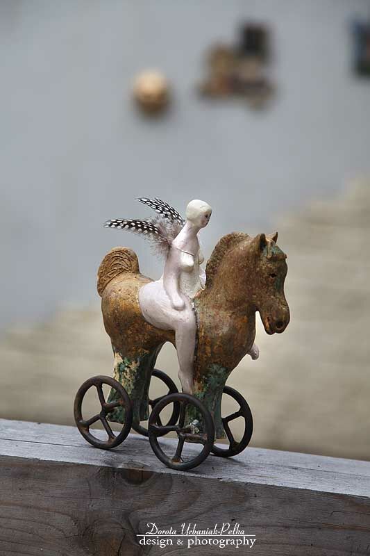 KOŃ WSPARTY NA STALOWYCH NIERUCHOMYCH KOŁACH.
