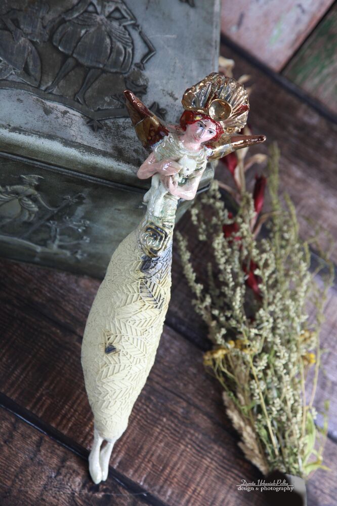 Skrzydła oraz liczne detale szkliwione miedzią oraz złotem.