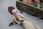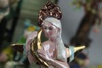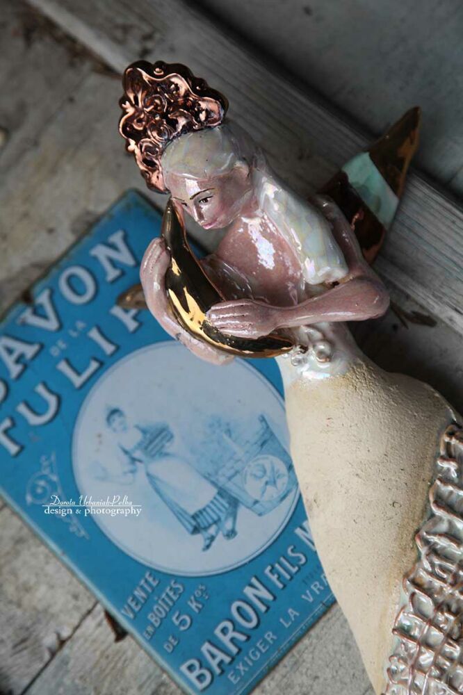 Skrzydła oraz nakrycie głowy oraz księżyc szkliwione miedzią oraz złotem.