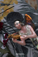 Surowość karbowanej szaty, ozdobionej delikatnymi śladami błyszczących zdobień, kontrastuje z błyszczącymi skrzydełkami, które odbijają światło i nadają rzeźbie blasku i elegancji.