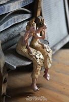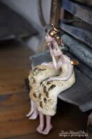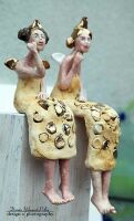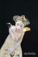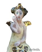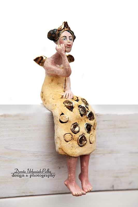 Ptaki, włosy oraz kostki na sukni szkliwione złotem.