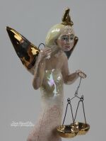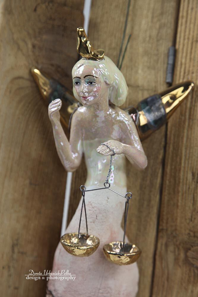 Skrzydła, szalki wagi oraz ptaszek pokryte złotem.