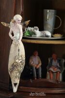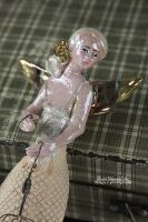 Skrzydła , klatka i kwiat we włosach szkliwione złotem.