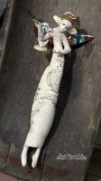 Skrzydła , nakrycie głowy oraz dziobek ptaszka pokryte złotem.