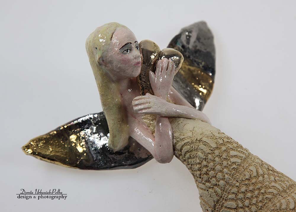 Skrzydła, serce, buciki szkliwione złotem.
