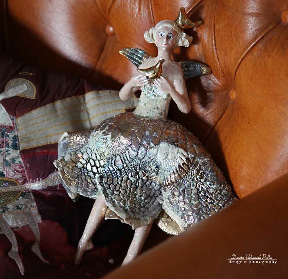 PTAKI SKRZYDŁA, SUKNIA SZKLIWIONA ZŁOTEM.