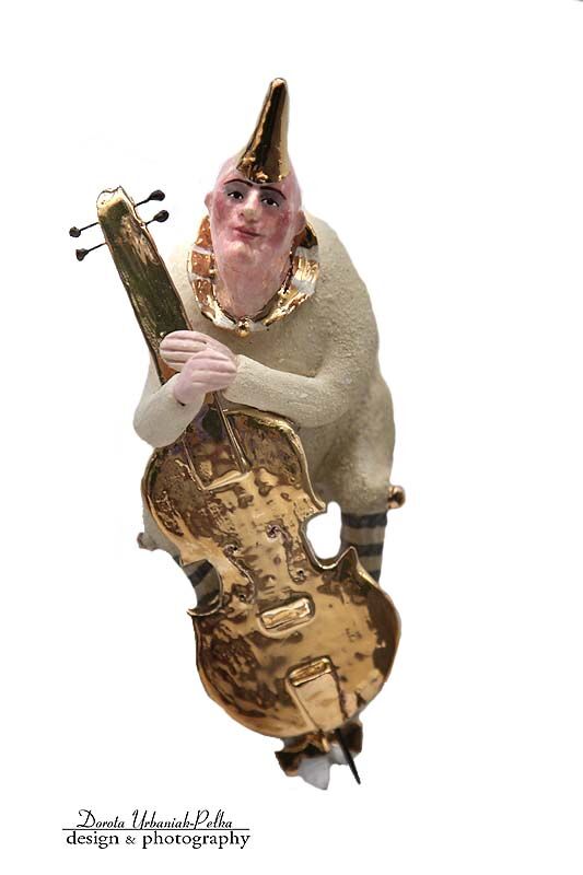 CZAPKA, WIOLONCZELA, ELEMENTY BUCIKÓW ORAZ SZATY SZKLIWIONE ZŁOTEM.
