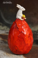 Królik na czerwonym jajku - marzenie każdego - kameralna rzeźba ceramiczna z kolekcji "Świat równoległy" - dekoracja autorstwa Cela37