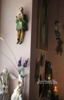 Elementy ubrania, skrzydła, kot oraz buciki szkliwione złotem.