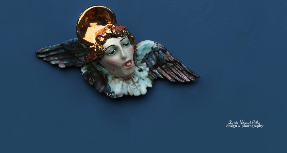 To jest… Unikatowa ceramiczna głowa anioła — ręcznie wykonane rzeźba ścienna z gliny szamotowej, wykończona akcentami szkliwa, złota i miedzi. Wypalana w temperaturze 1250°C, ekspresyjna i pełna charakteru. Głowa anioła to jedyny w swoim rodzaju obiekt artystyczny, stworzony, by wprowadzać do przestrzeni spokój, symbolikę i piękno sztuki.