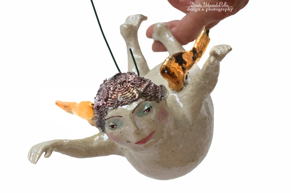 Anioł, który chciał rozprostować swoje zakurzone skrzydła – wisząca rzeźba ceramiczna z kolekcji „Świat równoległy” autorstwa Cela37.