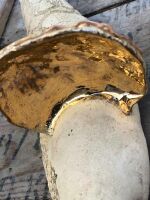 Skrzydła oraz nakrycie głowy oraz dno miseczki szkliwione miedzią oraz złotem.