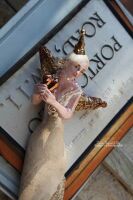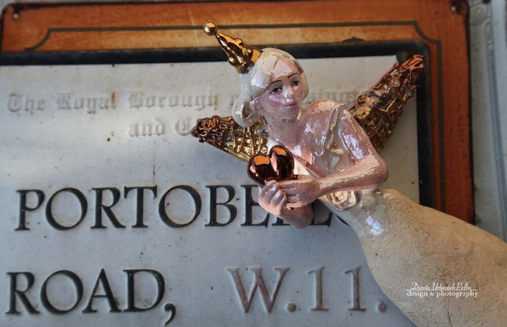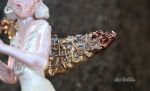 Skrzydła oraz nakrycie głowy oraz serce szkliwione miedzią oraz złotem.