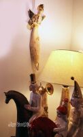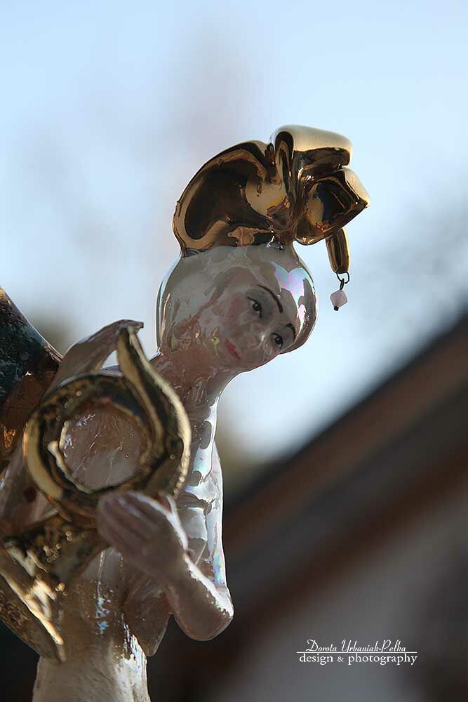 Skrzydła,trąba, rożek szkliwione złotem.