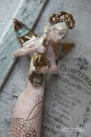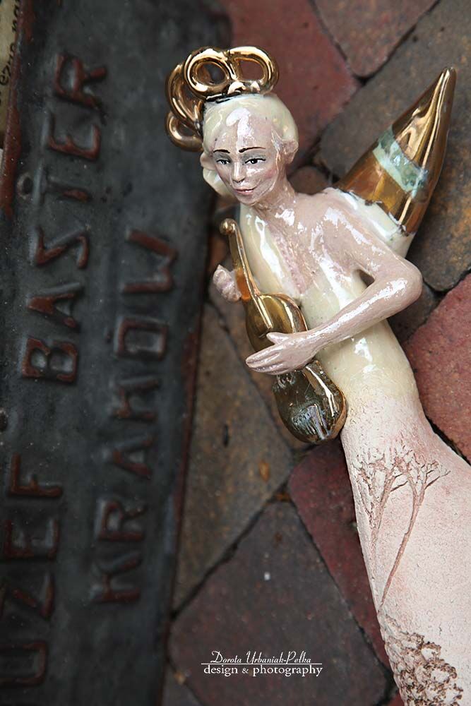 Skrzydła, skrzypce, nakrycie głowy szkliwione złotem.