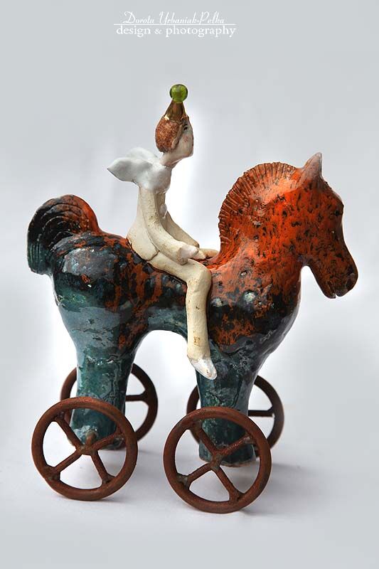 KOŃ WSPARTY NA STALOWYCH NIERUCHOMYCH KOŁACH.