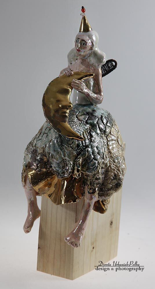 Rożek, księżyc oraz spódnica  szkliwione złotem.