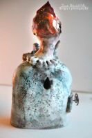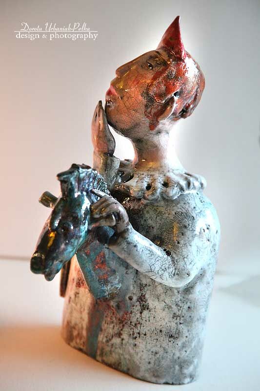 przeznaczony do zawieszenia na ścianie lub postawienia. Sekretnik wykonany z szamotu z szufladką funkcyjną boczną wykończony metalem. Szkliwiony w technice RAKU . Szufladka delikatnie pokryta szkliwnym złotem. Przedmiot ciekawy, nietuzinkowy, dekoracyjny. Egzemplarz pojedynczy.