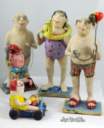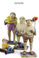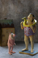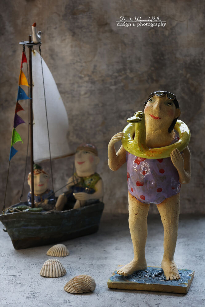 Ta ręcznie wykonana rzeźba z szamotu i kamionki przedstawia postać pływaka Jo w fioletowym stroju kąpielowym, dzierżącego żółtą kaczkę ratowniczą — symbol dziecięcej odwagi, humoru i surrealistycznej wyobraźni. Figurka łączy w sobie elementy art nouveau i współczesnej ceramiki artystycznej. Idealna jako dekoracja wnętrza, prezent dla kolekcjonera lub akcent w galerii sztuki.