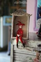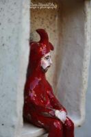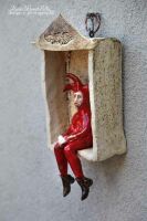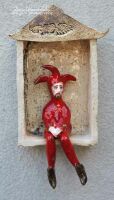 Postać Stańczyka do powieszenia na ścianie wykonana z gliny szamotowej.