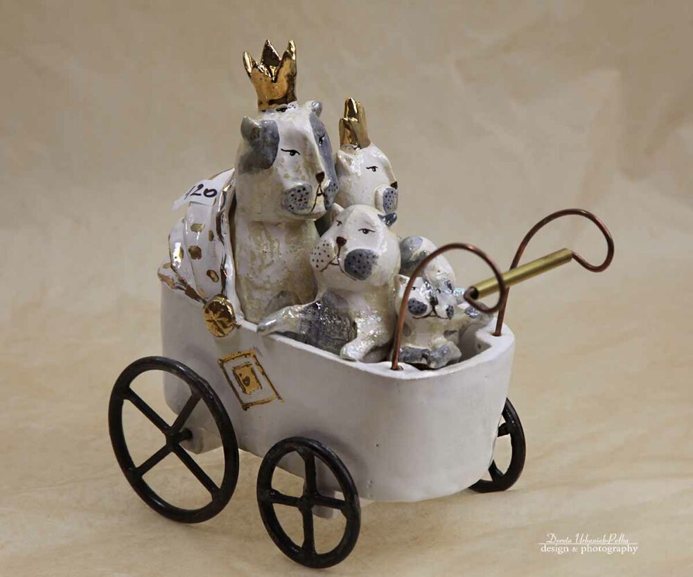 KORONY KOCIE, KROPKI I DETALE NA WÓŹKU szkliwione złotem.