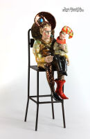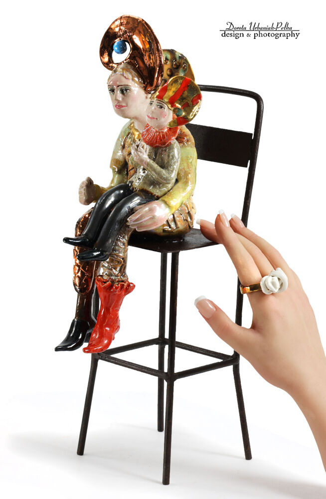 Figurka przedstawia ceramiczne postacie na metalowym krześle.
