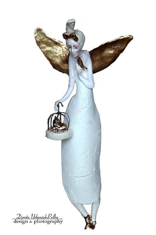 Skrzydła , buciki, kokarda, ptak oraz kot szkliwione złotem.