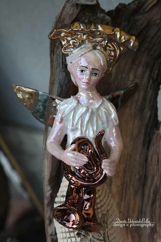 Skrzydła, nakrycie głowy szkliwione złotem .