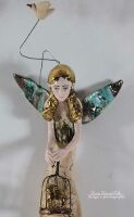Skrzydła , włosy oraz dziobel ptaszka pokryte złotem.