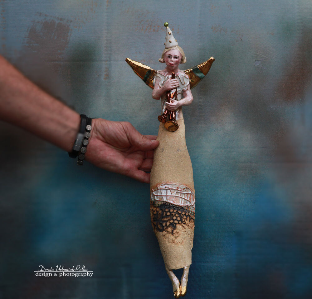 ANIOŁ TURMALINOWY Z MIEDZIANĄ TRĄBKĄ
