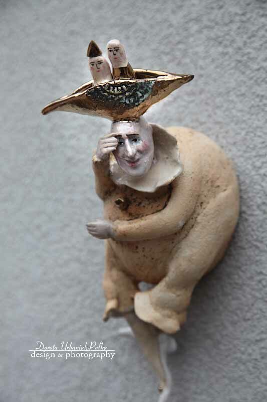 | Szamot szkliwiony tlenkami metali oraz złotem. POSTAĆ PRZEZNACZONA DO ZAWIESZENIA NA ŚCIANIE LUB POSTAWIENIA NA PÓŁCE. ŁÓDŹ , guziki ORAZ KULECZKI u bucików oraz elementy laleczki szkliwione złotem. wysokość - 30,0 cm szerokość - 10,5 cm głębokość - 14,0 cm |