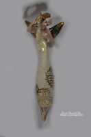Skrzydła, pióro oraz kwiaty we włosach szkliwione złotem.