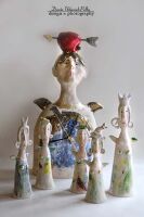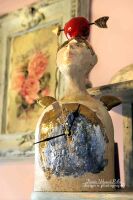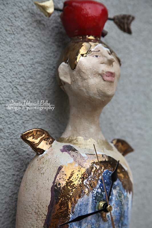 ZEGAR WYKONANY Z SZAMOTU. Szkliwo fakturowe. Włosy, skrzydła oraz tarcza zegarowa szkliwione prawdziwym złotem.