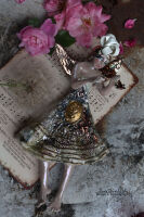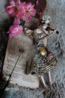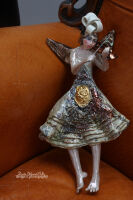 Surowość karbowanej szaty, ozdobionej delikatnymi śladami błyszczących zdobień, kontrastuje z błyszczącymi skrzydełkami, które odbijają światło i nadają rzeźbie blasku i elegancji.