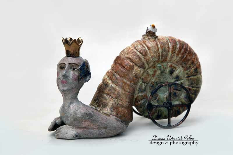 MUSZLA WSPARTA NA RUCHOMYCH METALOWYCH, PATYNOWANYCH KOŁACH.