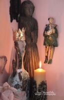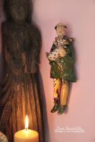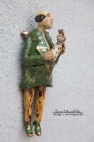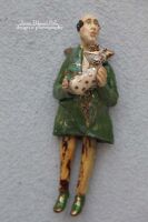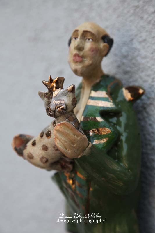 Elementy ubrania, skrzydła, kot oraz buciki szkliwione złotem.