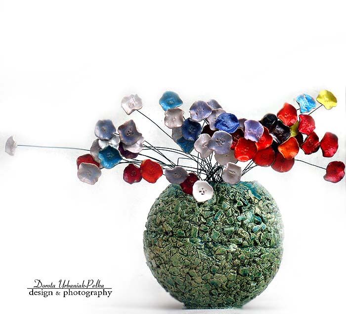 | Kamionka szkliwiona. Kwiat szkliwiony z obu stron co umożliwia naginanie kwiatu pod dowolnym kątem. Kwiat wykończony giętkim drutem umożliwiajacym używanie dekoracji nieskończenie wiele razy. Kolor drucika zielony. KWIATY RÓŻNOKOLOROWE |