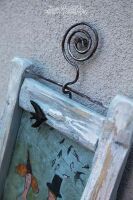 W DOLE DESKI METALOWA DRUCIANA PÓŁKA Z 3 JASKÓŁKAMI CERAMICZNYMI.