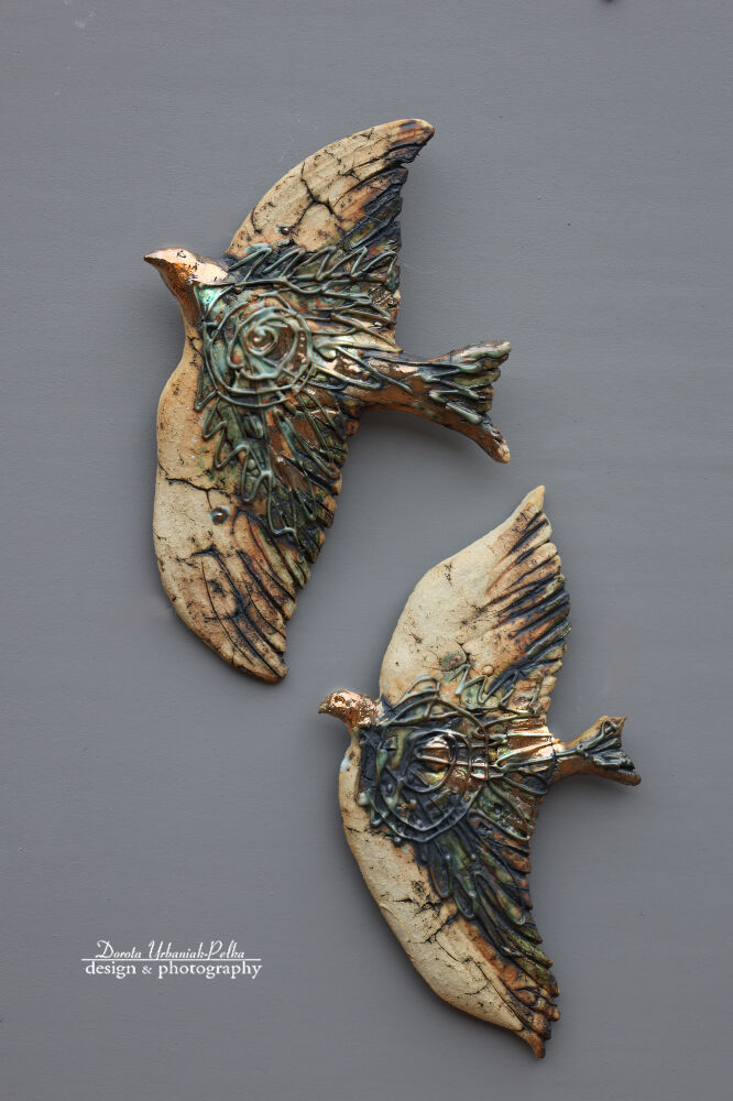 Para szamotowych ptaków - gołębie - dwa ceramiczne ptaki na ścianie - To wyjątkowy przedmiot z kolekcji "PARALLEL WORLD".