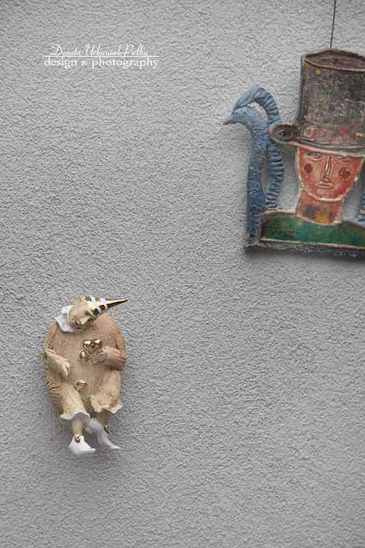 | Szamot szkliwiony tlenkami metali. POSTAĆ PRZEZNACZONA DO ZAWIESZENIA NA ŚCIANIE LUB POSTAWIENIA NA PÓŁCE. SERCE, CZAPKA, GUZICZKI, DETALE BUCIKÓW szkliwione prawdziwym 16-karatowym złotem. |